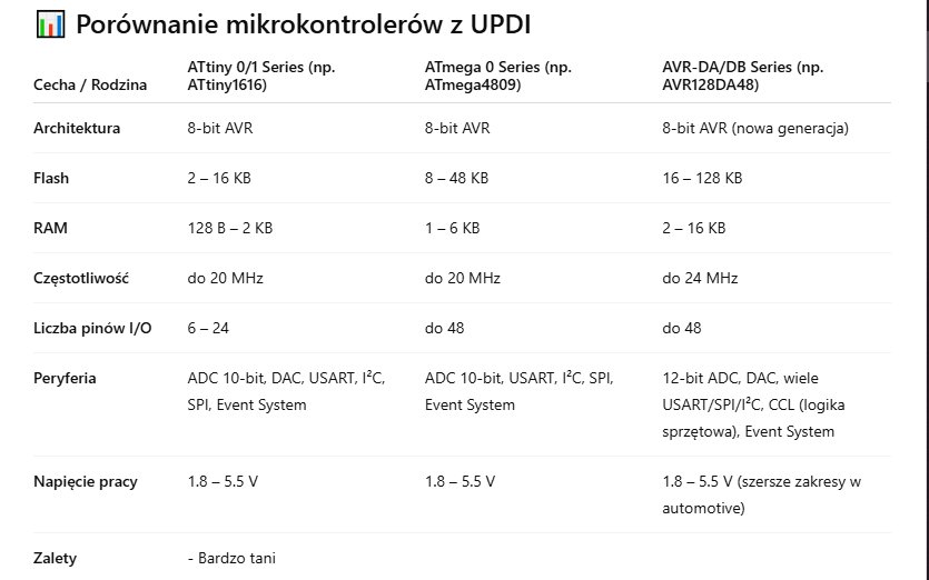 Polecamy mikrokontrolery - z rodziny AVR ATtiny i ATmega od Microchip, które wspierają interfejs UPDI, np. ATtiny1616, ATtiny1627, ATmega4809 oraz modele z serii AVR DB i AVR DD, np AVR32DB28. Te mikrokontrolery oferują dobrą wydajność, bogaty zestaw peryferii i są dobrze wspierane przez środowiska programistyczne, takie jak MPLAB X i Studio.