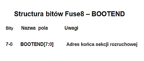 - Koniec sekcji rozruchowej. MCU czyta Fuse8 i wie, które adresy Flash należą do bootloadera, których nie wolno nadpisać przy programowaniu aplikacji Szczegóły bitów: