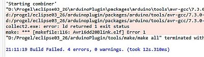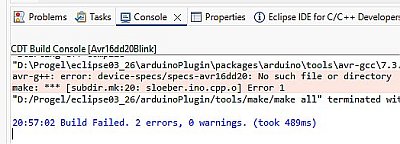 2. Przykładowe błedy kompilacji projektu: Avr16dd20Blink dla mikrokontrolera AVR16DD20 z pakietem sprzętowym DXCore.