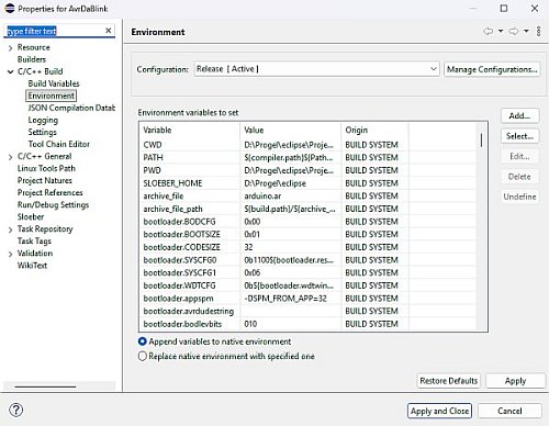 Zmienne środowiskowe projektu - to pary klucz-wartość (np. DB_HOST=localhost), przechowywane poza kodem źródłowym, które konfigurują zachowanie projektu w środowisku tworzenia projektu. Ustawienia mikrokontrolera jego parametry, zegar i bity konfiguracujne. Podczas kompilowania projektu, często konieczne jest ustawienie opcji kompilacji przy użyciu informacji, które nie znajdują się w pliku projektu lub plikach składających się na projekt. Te informacje są zwykle przechowywane w zmiennych środowiskowych. Są ustawiane podczas tworzenia projektu i wyboru jego konfiguracji.
