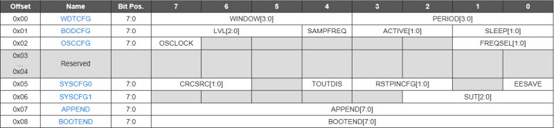 Fuse bity AVR UPDI - trudny temat i często powodujący blokadę układu, głównie przez nieprawidłowe ustawienie opcji taktowania lub programowania. Fusebity tych mikrokontrolerów są inne niż fusebity typowych AVR. ATTINY serii 0,1 posiadają 9 rejestrów bezpieczników oznakowanych do dostępu z zewnątrz jako Fuse0 - Fuse8. Niektóre z nich są zarezerwowane i nie należy ich ustawiać. Poniżej przedstawiono rozkład fusebitów.