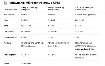 Polecamy mikrokontrolery - z rodziny AVR ATtiny i ATmega od Microchip, które wspierają interfejs UPDI, np. ATtiny1616, ATtiny1627, ATmega4809 oraz modele z serii AVR DB i AVR DD, np AVR32DB28. Te mikrokontrolery oferują dobrą wydajność, bogaty zestaw peryferii i są dobrze wspierane przez środowiska programistyczne, takie jak MPLAB X i Studio.