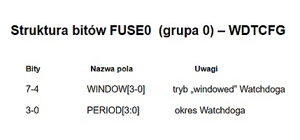 🔹 Fabryczna (bezpieczna): WINDOW = 0x0, PERIOD = 0x0, Fuse0 = 0x00 ✔ WDT wyłączony.