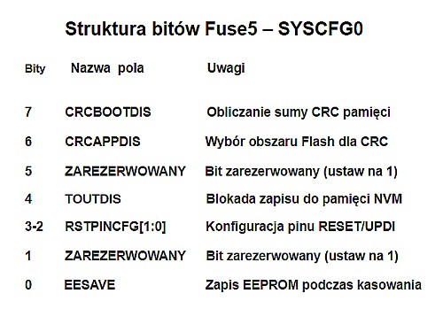 - ustawienia mikrokontrolerów tego typu zostały rozdzielone i pogrupowane w kilka grup. Oto kolejna z nich - Fuse5. To jest ważny fuse systemowy, grupuje funkcje związane z dostępem i bezpieczeństwem, m.in.: konfigurację pinu RESET, konfigurację UPDI, opcje CRC pamięci programu. Potrafi zablokować mikrokontroler.