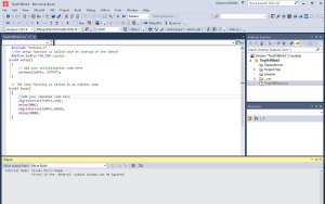 Zrzut ekranu z programu - po tych zabiegach, wygląd programu po otwarciu projektu Arduino. Pasek narzędzi tuż nad edytorem zawiera elementy konfiguracji, kompilacji (budowania ) i wgrywania otwartego projektu do mikrokontrolera. Kliknij w obrazek obok, aby go powiększyć.
